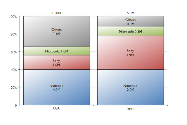 Now Nintendo has a 40% share of both markets. But in the USA they’re a lot more comfortable than in Japan, where Sony are close behind.