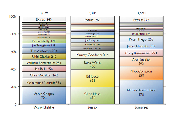 Now there’s a few things to draw from this but let’s start with Warwickshire, where Varun Chopra has scored 20% of the team’s total runs, and Sussex, where Chris Nash has also scored 20% of the total.
