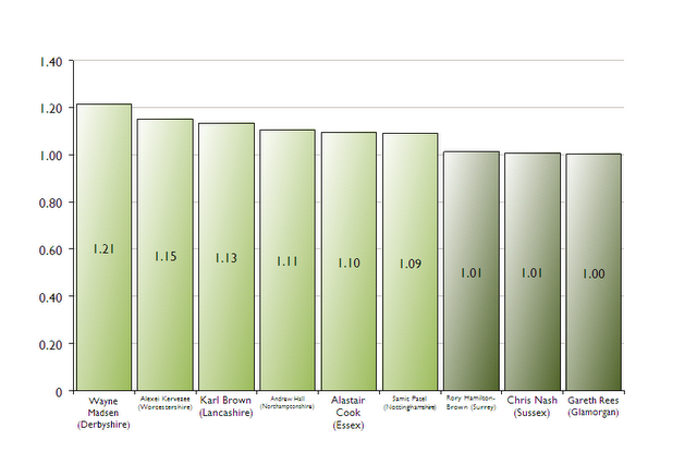 Here the bigger the number the more ‘one man teamy’ a side is. In Warwickshire’s case this value is very high (anything above 1.5 should probably be considered high), emphasising how dependent they are on one player. For Sussex it couldn’t be much lower, emphasising how they’re not dependent on one player but in fact on a number of players.