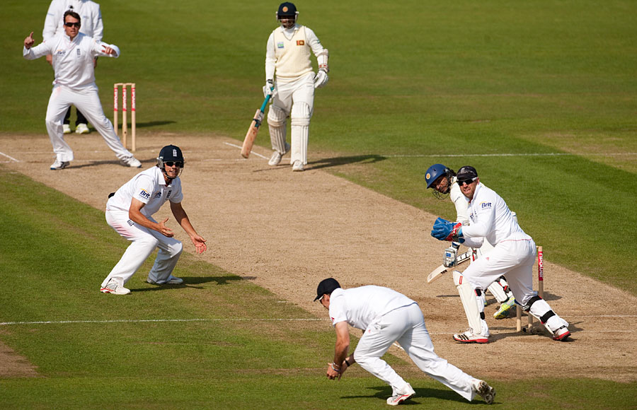 The 18th over of the Sri Lankan innings. From around the wicket Swann bowled a beautifully flighted off-break that dipped and with a hint of turn took the edge of Sangakarra’s bat and carried to slip. Three balls later, this time over the wicket, Swann bowled a slightly quicker ball wide of Maharoof’s off stump. Despite a bold forward defence, he nicked it to the grateful Prior.