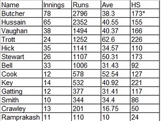 Over the last twenty years 13 different players have batted at least 10 times at No. 3 forEngland. So we’re discounting nightwatchmen (Fraser, Hoggard), temporary changes to the order (Gooch, Pietersen) and Jason Gallian.