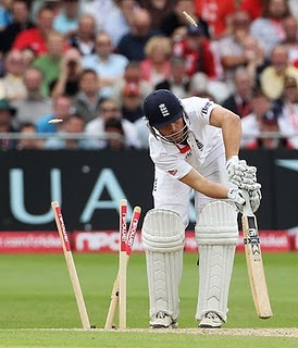 Of Trott’s 27 test dismissals (he’s been not out four times), 13 have been caught (48%), he’s been bowled nine times (33%), trapped lbw three times (11%) and run out twice (7%). It might be easier to start with how not to get him out. The fact that he has only been out lbw a meagre three times shows his strength off his pads. As Ricky Ponting grew increasingly desperate for Trott’s wicket during the Ashes, he had his right arm seamers consistently aim at Trott’s pads over the wicket and he feasted on this, whipping everything through the leg-side. This ploy from Ponting did not work once during the series. Trott was out once to lbw, and that was from a rare inswinger that the left handed Mitchell Johnson managed to get on target during the hour at Perth where he remembered how to bowl, Trott tried to play through the offside and was pinned in front by the late movement. One of the other two times Trott has been out lbw was also to a left arm seamer, Mohammed Amir. Trott padded up to a ball angled across him and was given out, albeit somewhat dubiously. The final time he has been given out lbw was to Morne Morkel in the series in South Africa, the one time in an England shirt that he has looked uncomfortable. Whether it was the pressure of being back in SA or something else, we may never know, but it was an uncharacteristic wobble for someone usually so unflappable. This time Trott did play a loose shot across the line and was struck in front.