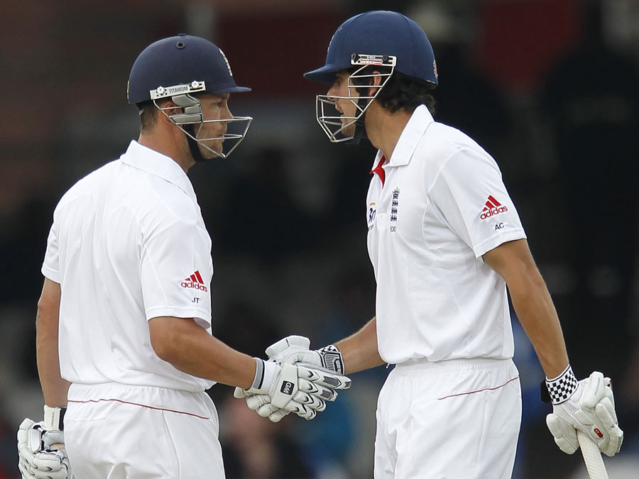 England 149-2 (Cook 61*, Trott 58, Pietersen 15*, Herath 1-17)