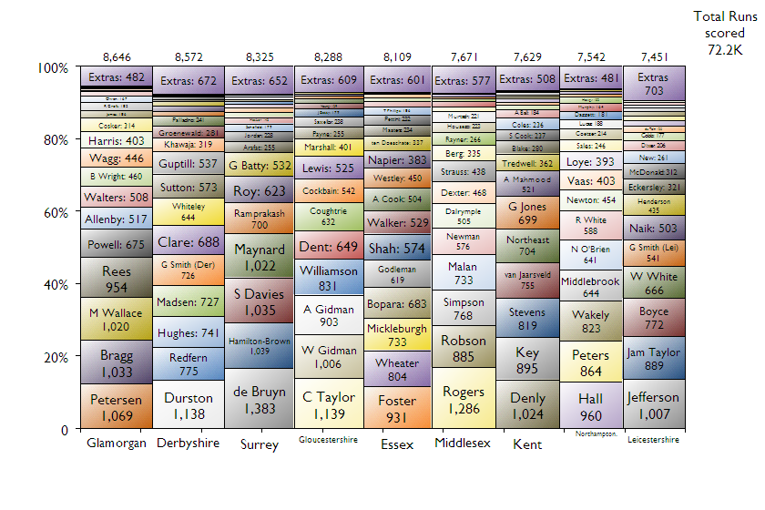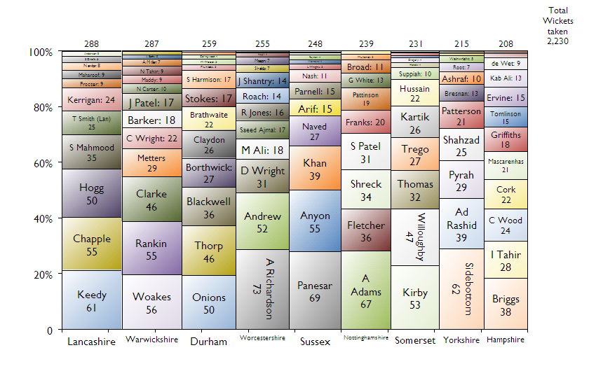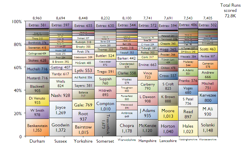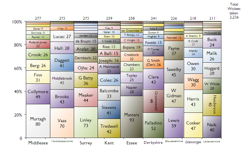 Quite an even spread here – every team had at least one batsman that reached 1,000 runs – but you can see the importance of Marcus Trescothick to Somerset and how Warwickshire nearly won the title through everyone chipping in (bar the more substantial contribution of Varun Chopra).