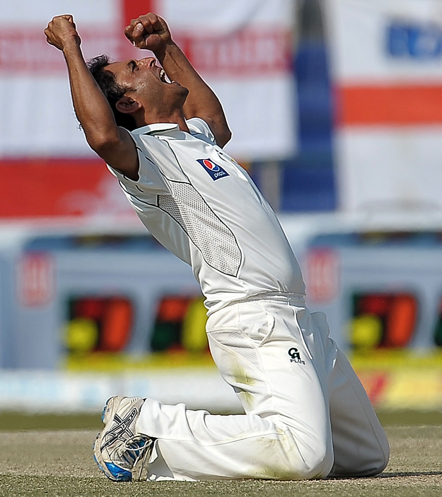This time around, it was the left-armer who took the wickets. Abdur Rehman bowled sharply and accurately for 10.1 scintillating overs, during which he made England look as competent as Walmington-on-Sea Home Guard. His figures of 6-25 (9-92 in the match) lead to him receiving the man of the match award, however his colleague Saeed Ajmal also contributed to the away team’s downfall with 3-22. These two, ably supported by Mohammad Hafeez (1-11 from eight overs at the start of the innings), are not yet in the Muttiah Muralitharan class, but nor are they the sort of pie-chucker such have previously troubled England. They are very fine players who bowled as the conditions required. Credit must also go to Misbah-ul-Haq for his generally level-headed captaincy and who was constantly trying to keep the bowlers and close fielders calm and focussed despite the frantic atmosphere. However we doubt any leader could keep Adnan Akmal in check, his regular appealing whenever ball struck pad or reached a fielder verging on the ridiculous.