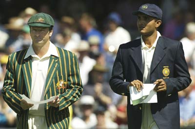 Australia won the toss and batted, losing Slater in the first over to Zaheer Khan. The more alert among you might have noticed that India didn’t have a second seamer in their side, but you didn’t account for Saurav Ganguly. He shared the new ball for two courtesy overs, before getting Harbhajan in. He removed Langer with score at 67, and the walking wicket, Mark Waugh, came to the crease.