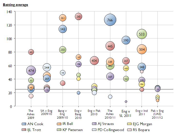 We’ve colour-coded each batsman to hopefully make it a little clearer. We should also point out that for the Sri Lanka in England series in 2011 Ian Bell averaged 331 – we told you there’d be a callback – but we had to cut that off the top of the chart. Ian Bell was amazing back then. Nowadays he’s about as prolific as Fernando Torres.