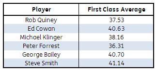 Peter Forrest, George Bailey and Rob Quiney all averaged near or over 50 during the most recently completed Sheffield Shield season, but as a glance at their overall First Class averages above will suggest, these were exceptions rather than the rule as far as their career performances are concerned. Yet these one-off seasons are enough to have them on the fringes of the Test squad. If we were in Stuart Law or Jamie Siddon’s shoes we would probably feel like hitting someone right now.
