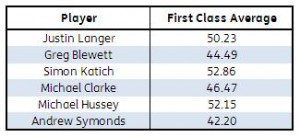 It’s undoubtedly fair to say that there’s been a massive drop in the level of performances required to threaten the established Test batsmen. Going back to the last decade, Brad Hodge broke into the Test team for the first time in Nov 2005 after a 2004/5 domestic season in which he averaged 63, slightly up on the 61 he averaged the season before. Michael Hussey played his first Test the following season, just reward for having maintained a First-class average of above 50 for more than ten years. Martin Love maintained a similar average over an equal period before his Test debut in 2002, although his Test career lasted only five appearances. In fact it’s much the same story for nearly all the batsmen who managed to break into the Test ranks during this period, from Darren Lehmann (First-class average 57.83) to Phil Jaques (49.84).