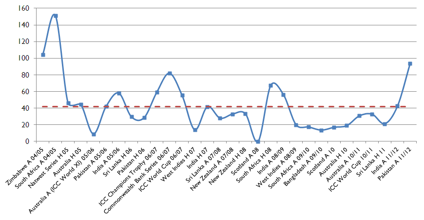 What this does show is that after a stellar start (from 2004/05 through to the 2006/07 World Cup) things dropped off massively. From then through to the recent series in the UAE, all eighteen series, Pietersen only averaged 40 or more five times. From the West Indies tour of 2008/09 (that we occasionally like to mention) to last year’s visit of Sri Lanka he didn’t manage it once.