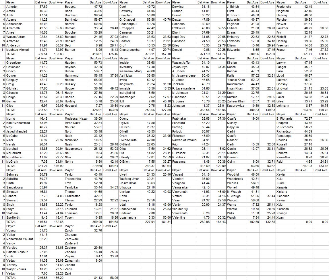 There’s no easy way to compare teams of this ilk, which span generations, continents and gender. What we have done though, is to add up each team member’s batting average to produce a team average. In terms of bowling, we tried to give each side a five-man attack. Therefore we’ve taken the sum of those bowling attack averages and doubled it, to give an average number of runs to take ten wickets, assuming two wickets per bowler. Hey, it’s cricket, not brain science. Mind you, this was not possible for the teams without eleven Test players, so no luck Z, Y, X, U and Q.
