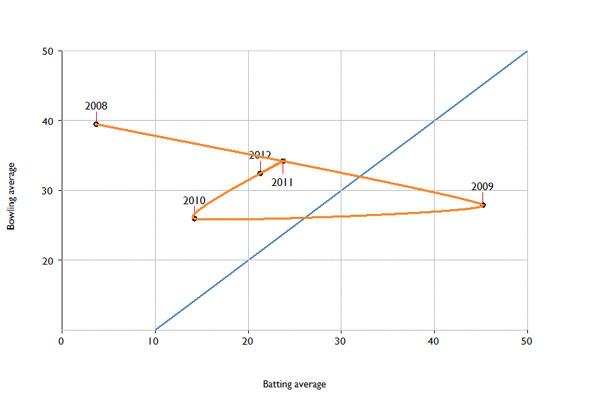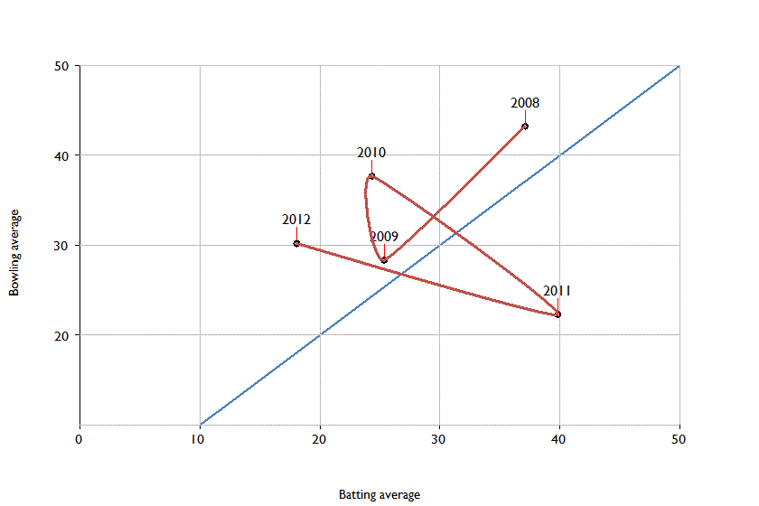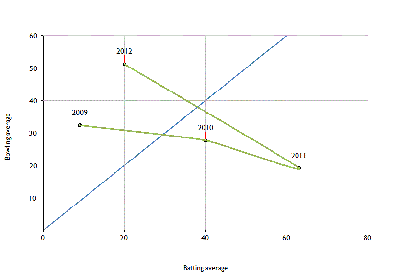 All we have in this chart is Bresnan’s Test batting average on the x axis and his bowling average on the y axis, shown by year. The blue line just shows where the two are the same. Every player is aiming for the bottom right corner of the chart i.e. a high batting average and low bowling average. Of course, only the very best players can approach such perfection, although Craig Kieswetter was pretty close in the last County season. We can see Bresnan making his way nicely towards that bottom right corner, growing as a player from his debut in 2009 (two matches) through 2010 and 2011 (four matches each) before it all goes distinctly pear-shaped in 2012 (in which Bresnan has played seven matches).