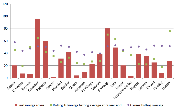 Perhaps the most relevant analysis is around the relationship between the career average (the purple circle) and the rolling average for the last ten innings (the green square). This gives us a very good view of whether a player was in decent nick at the very end. In only five of our 21 cases was the latter higher than the former. In all the rest, things were on the way down with some very low rolling averages: Ponting’s was just 17.4, Cowdrey’s 19.9 and VVS Laxman’s barely better at 21.8.