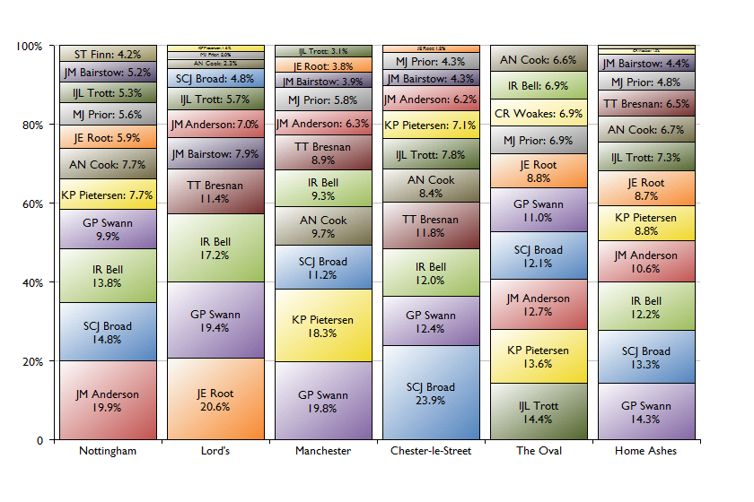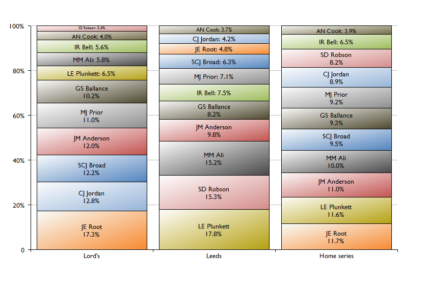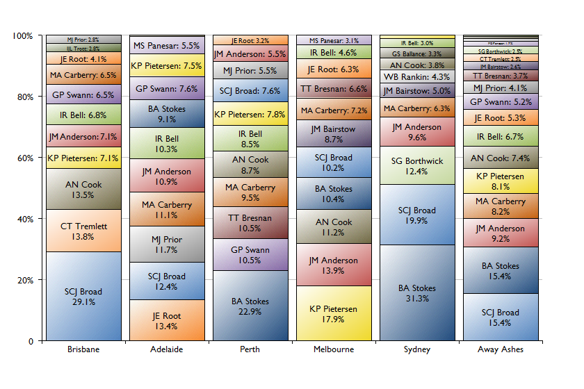 There’s an important context to this chart, which is that all of these matches contained truly terrible England performances. As such, the outstanding individual efforts (Broad in Brisbane, Stokes in Perth and Sydney) were all more King Canute trying to turn back the tide than Botham ’81 match-winning epics. Across the series, it’s those two that stand out by a long way, particularly when we consider that Stokes didn’t even play at the Gabba and yet only marginally missed out on top spot overall.