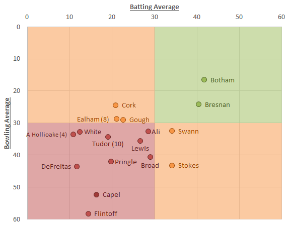 We’ve split the chart into four quadrants, which we can broadly call ‘Bowlers who bat’ (top left), ‘Genuine all-rounders’ (top right), ‘Batsman who bowl’ (bottom right) and ‘Shitty all-rounders’ (bottom left). What this clearly shows us is that there’s an enormous gap between Botham and everyone else, with Tim Bresnan, who made an unforgettable start to his England career, the closest. Disturbingly, there are only seven members of the chart that don’t live in the rather jammed bottom left quadrant. If ever a small red square said anything about English cricket over the last two decades, it’s that one.