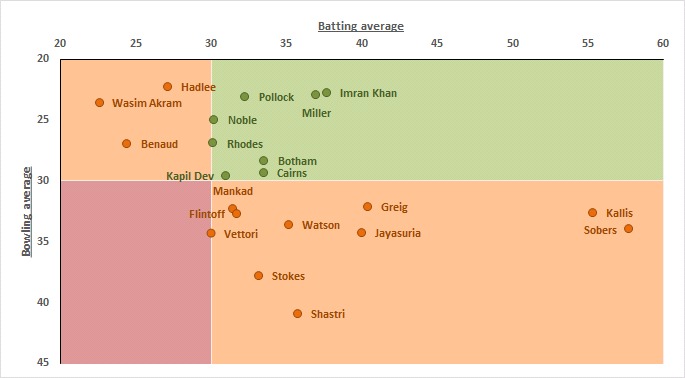 Instead, the real interest is in that top right quadrant, the green zone for the greatest allrounders that we’ve ever seen. And Chris Cairns. There’s no arguing with the great names in there – Sir Ian Botham, Kapil Dev, Keith Miller, Imran Khan, Wilfred Rhodes, Monty Noble and Shaun Pollock. And Chris Cairns. All of these managed the true allrounder feat of having a bowling average below 30 and a batting average about 30.
