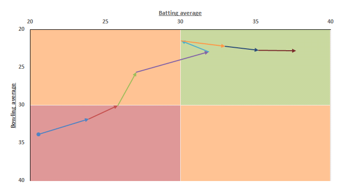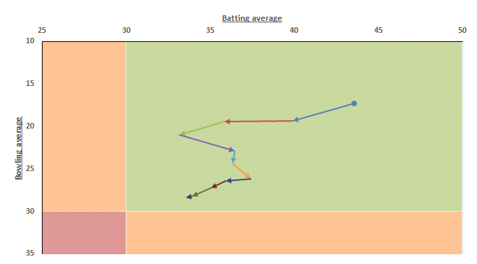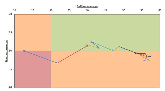 Having looked at each player’s final destination, there remains the small matter of the journey to get there. To look at that we’ll break their career down into 10 Test chunks and track their cumulative batting and bowling averages at these milestones. This is a so called ‘wiggle’ chart, something that we have featured before to almost complete silence from the 51allout readership. Maybe Oliver was on holiday that week or something.