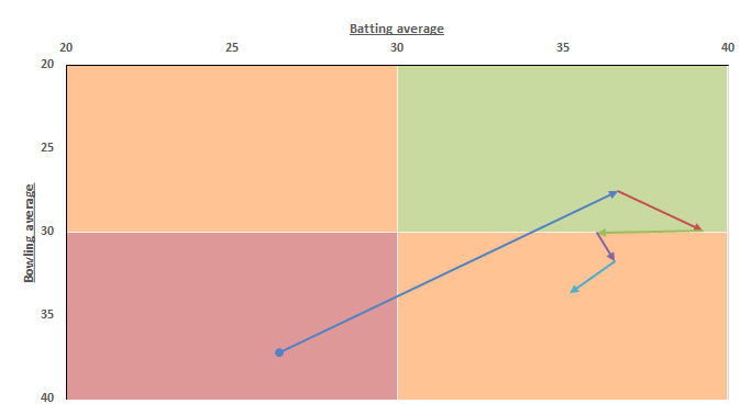 The first thing to note from this is that none of these great allrounders are in the dreaded red zone. Which makes sense really, given that if they were they probably wouldn’t be classed as great allrounders. This oversight means that the bottom left quadrant of our chart is basically wasted space, like a middle order containing James Vince and Gary Ballance.