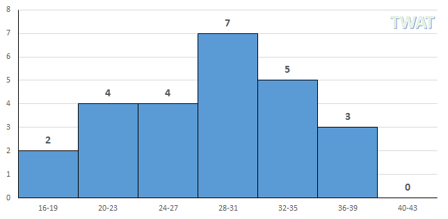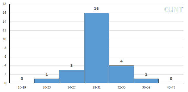 What this shows is that there seems to be a very clear trend (in what statisticians would call a bell curve), with 16 of our 25 man sample peaking in the 27-31 age band and the majority of the remainder either just before or after that. No-one seems to peak when they’re either very young or really old. Basically it looks exactly like you might expect if you didn’t actually do the analysis and instead just guessed at the results while saying “bollocks!”.