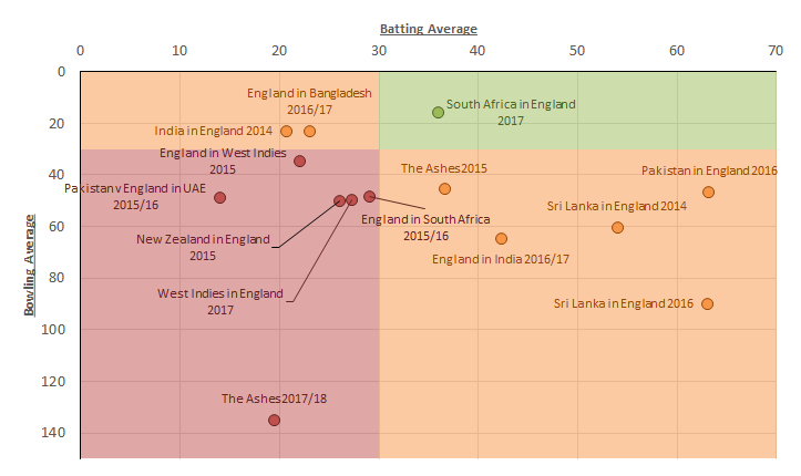 Something that we’ve touched on several times before is looking at the magic numbers for a Test allrounder: a batting average above 30 and a bowling average below 30. However, this has generally been in the context of an entire career. Here we’ll look at it on an individual series basis, and classify each series based on the results:
